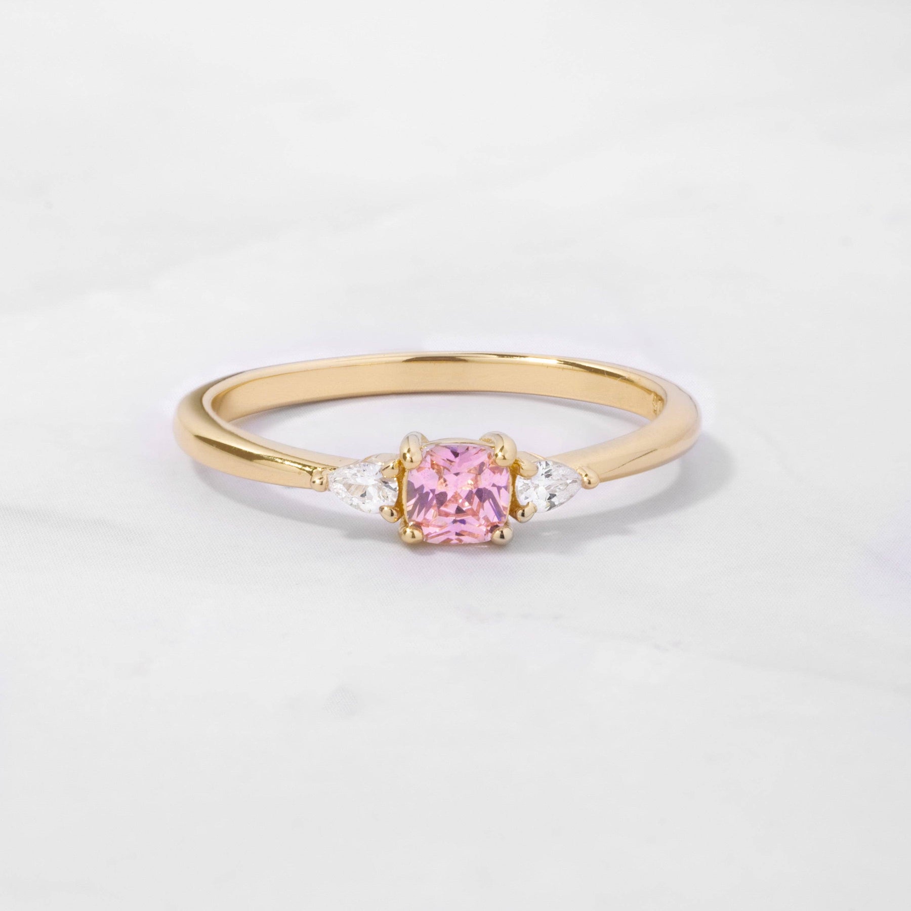 This delicate Pink Cushion Ring is perfect for anyone who loves a minimalist style or enjoys stacking rings. It features a charming pink cushion-cut stone flanked by pear-shaped stones for a subtle yet eye-catching pop of color. Crafted from 925 Sterling Silver with thick 14k gold or rhodium plating, this ring is designed to last. The high-quality cubic zirconia stones give it a beautifully authentic sparkle.