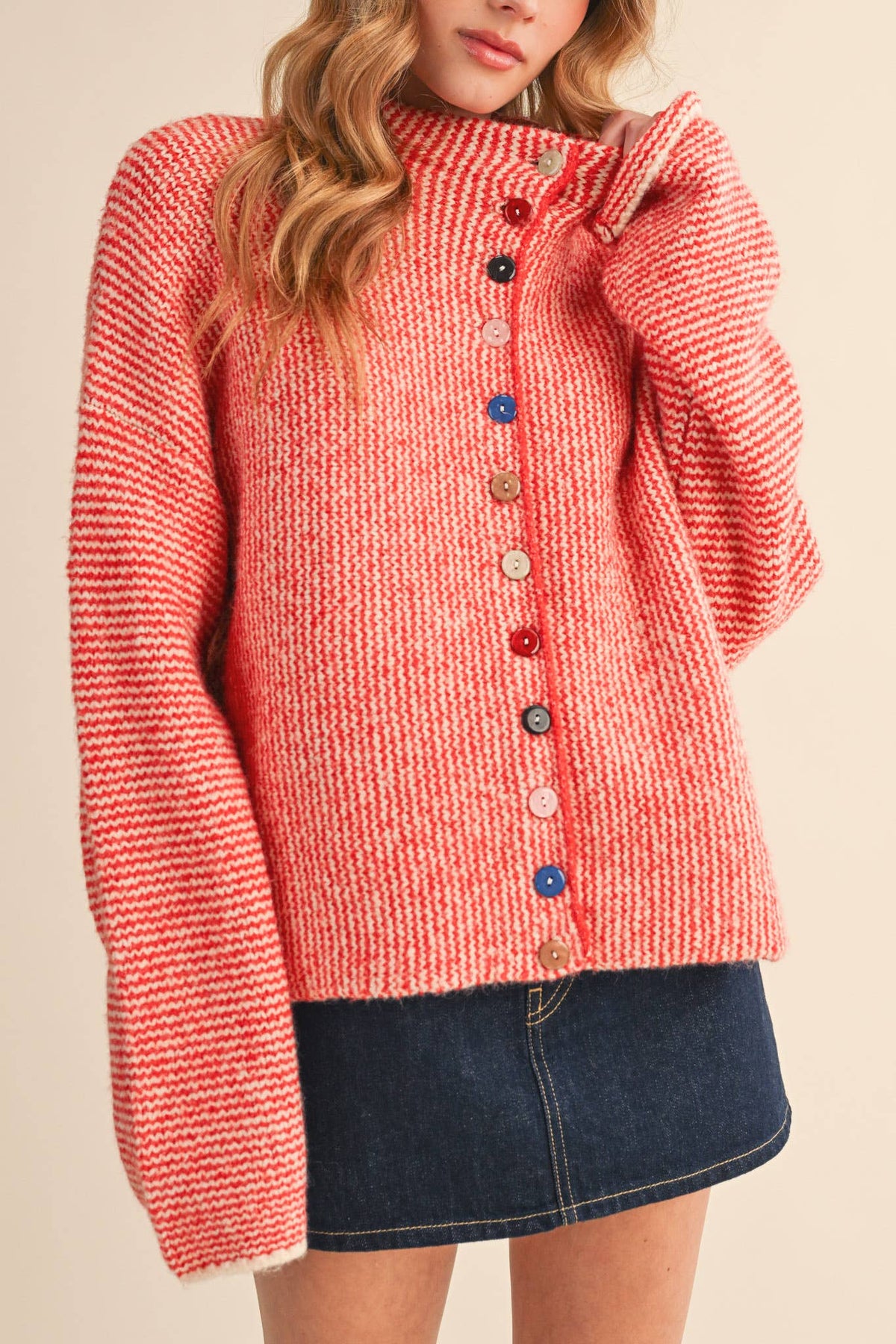 Jodie Striped Colorful Button Cardigan Layer up with effortless style in this striped cardigan featuring a standout stand collar and vibrant button details. The relaxed fit and waist-length cut create a flattering silhouette perfect for casual days, while the button-down placket makes it easy to style open or closed. Pair it with your favorite basics for an instantly polished look.