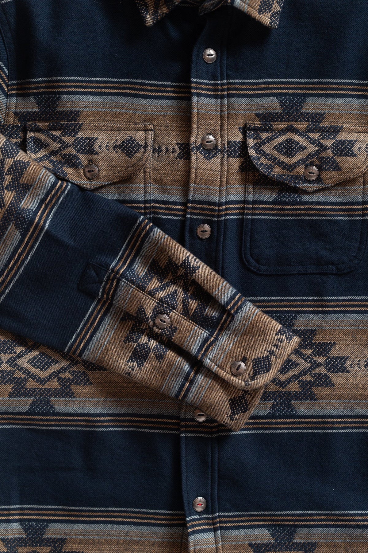 Well, the Klamath Flannel Shirt is cut by hand to ensure that all Jacquard loomed details are fully lined up. This 100% heavyweight cotton flannel is pre-washed + brushed for an extra soft feel and keeps you warm whether you're on that daily two-wheeled ride or sitting around the camp fire in the middle of the desert.  Double + triple needle felled seams throughout means this southwestern stripe shirt is going to be a staple in your wardrobe for years to come.