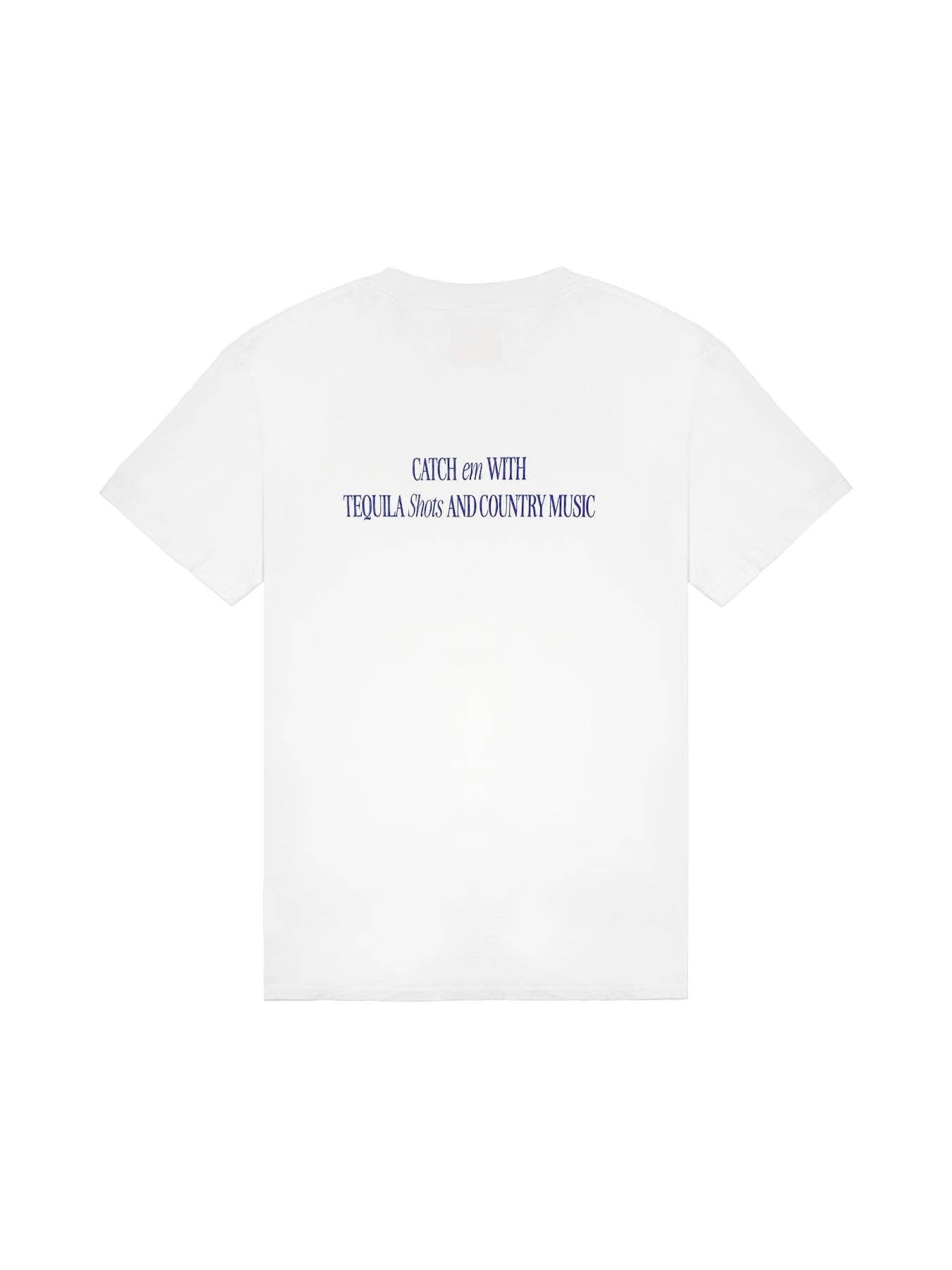 Featuring the phrase “Catch ‘em with tequila shots and country music” in navy print on the back, giddy up - this one won't last long.