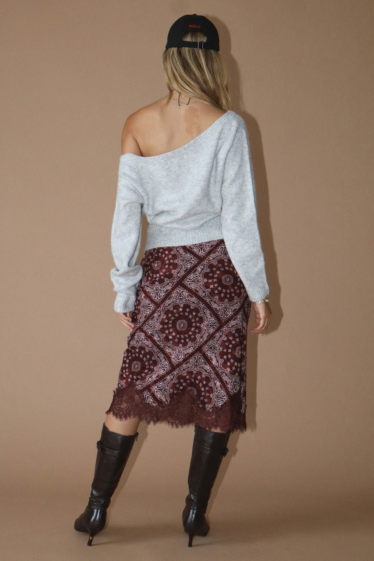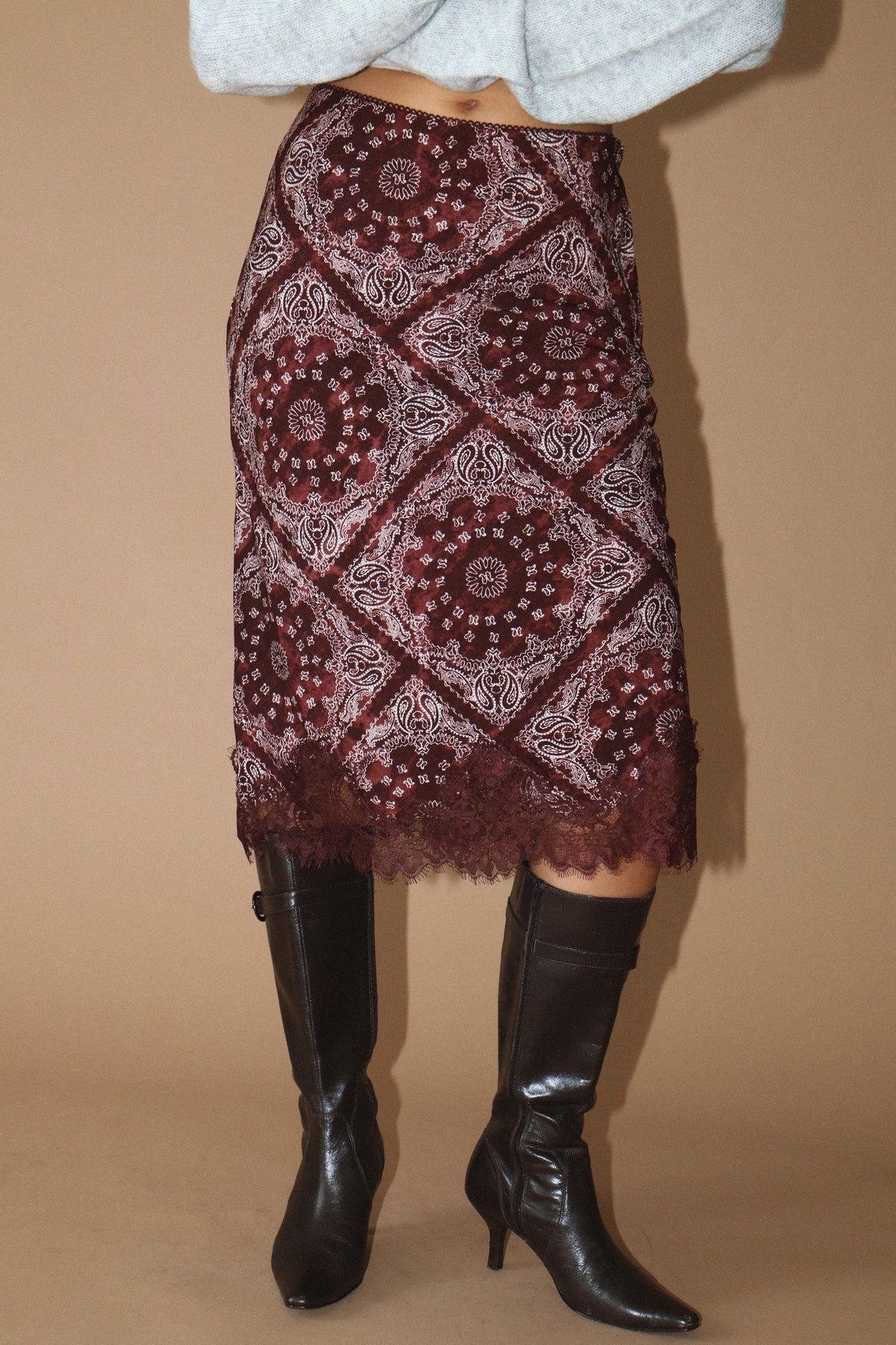 Elevate your everyday style with the Rue Paisley Lace Trim Midi Skirt. This versatile piece features an eye-catching paisley print that brings personality to any outfit, while delicate lace trim along the hem adds a touch of feminine elegance. The midi length offers a flattering silhouette that works for casual outings or dressed-up occasions.